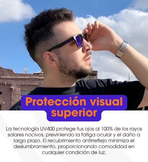 La tecnología UV400 protege tus ojos al 100% de los rayos solares nocivos, previniendo la fatiga ocular y el daño a largo plazo. El recubrimiento antirreflejo minimiza el deslumbramiento, proporcionando comodidad en cualquier condición de luz. |