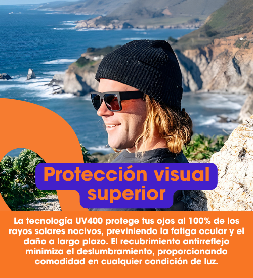 La tecnología UV400 protege tus ojos al 100% de los rayos solares nocivos, previniendo la fatiga ocular y el daño a largo plazo. El recubrimiento antirreflejo minimiza el deslumbramiento, proporcionando comodidad en cualquier condición de luz.